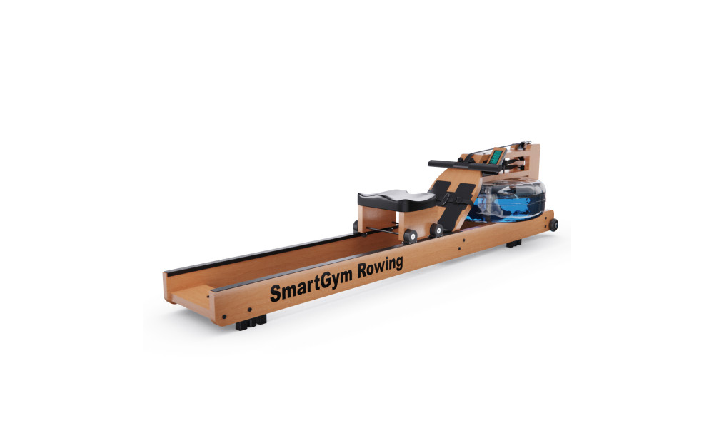 Консоль гребного тренажёра SmartGym имеет 8 уровней регулировки педалей и показывает время, расстояние, калории, пульс и обороты в минуту. Система нагрузки является водной: чем больше вы зальёте в бак воды, тем больше будет нагрузка. Транспортировочные ролики позволяют легко перемещать тренажёр, а его размер в сложенном виде составляет 60 x 56,5 x 210 см.