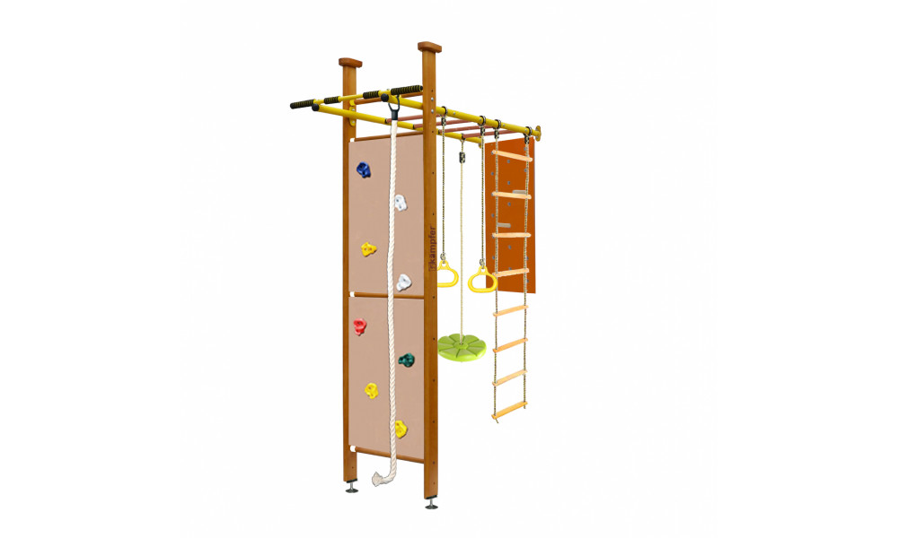 Домашний спортивно-игровой комплекс Kampfer Joy это новинка из линейки деревянных ДСК Kampfer в цветовой гамме на выбор, что позволяет подобрать нужный оттенок под дизайн помещения. Уникальная конструкция Kampfer Joy включает в себя скалолазную стенку на двух стойках, металлический турник с рукоходом и набор из самых популярных навесных аксессуаров канат, кольца, веревочную лестницу, пластикову лиану, а также новинку деревянный пегборд. Крепкий металлический турник выдерживает нагрузку до 120 кг, подходит как детям так и взрослым. Навесное оборудование Kampfer на прочных тросах выдерживает нагрузку до 100 кг. Допустимая нагрузка на скалолазную стенку, пегборд 50 кг. Особенностью спортивно-игрового комплекса Kampfer Joy является уникальная конструкция, совмещающая в себе и пристенное и распорное крепление, большой двойной скалолаз имеющий 8 пластиковых зацепов. Малышам очень нравится - лазить по скалолазу, забираться вверх по веревочной лестнице, перебираться по пегборду, висеть на канате и качаться на лиане - играя одновременно тренироваться выполняя все необходимые для физизического развития упражнения.